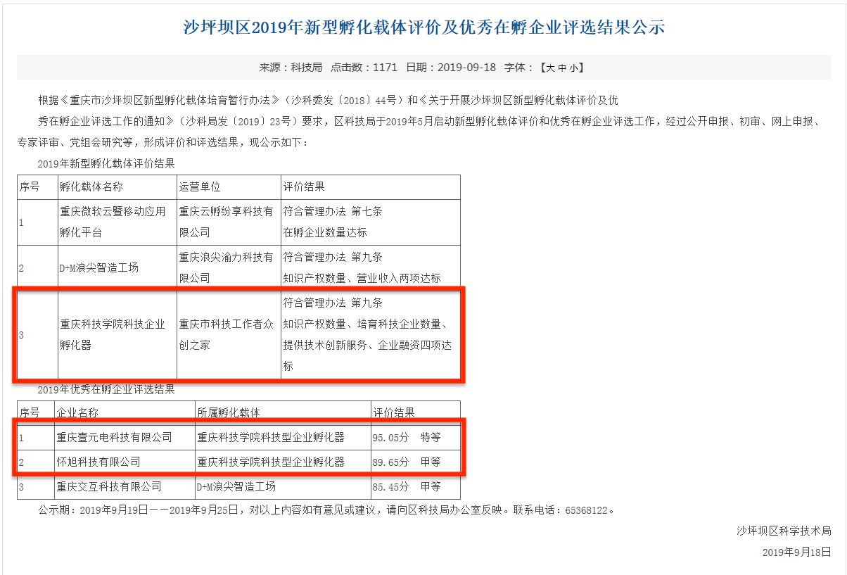 【供稿/科研处众创空间 张欢】按照《重庆市沙坪坝区新型孵化载体培育暂行办法》(沙科委发〔2018〕44号)和《关于开展沙坪坝区新型孵化载体评价及优秀在孵企业评选工作的通知(沙科局发〔2019〕23号)有关要求,经过沙区科技局对新型孵化载体和优秀在孵企业开展评选工作,我校众创空间从沙区多家科技企业孵化器中脱颖而出,平台及入驻企业均获佳绩。