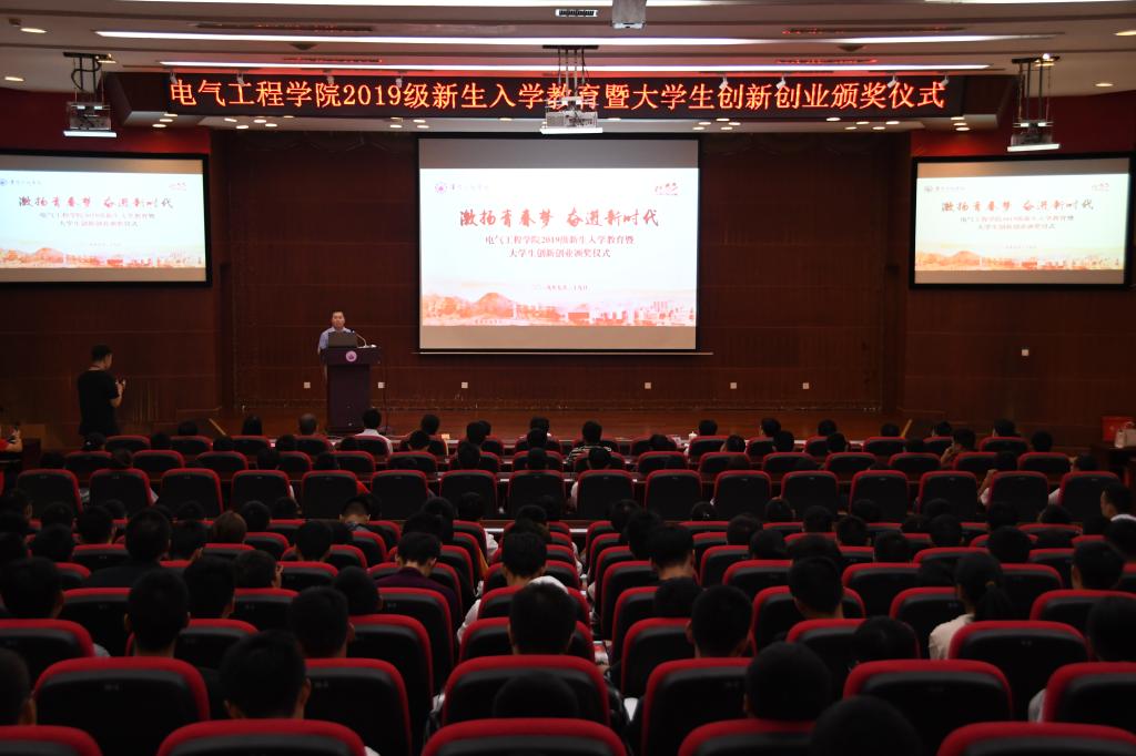 【供稿/电气工程学院】为帮助2019级新生尽快适应大学学习生活、明确目标、端正态度、科学规划,9月29日,电气工程学院在学术报告厅举行“激扬青春梦,奋进新时代”2019级新生入学教育暨大学生创新创业比赛颁奖仪式。校党委副书记、副校长施金良,学生工作部部长张琪,优秀校友代表格力电器(重庆)有限公司技术骨干罗讯、电气工程学院党政领导、各系(中心)主任、专业负责人、专兼职辅导员、2019级新生全体共计300余人参加了本次活动。